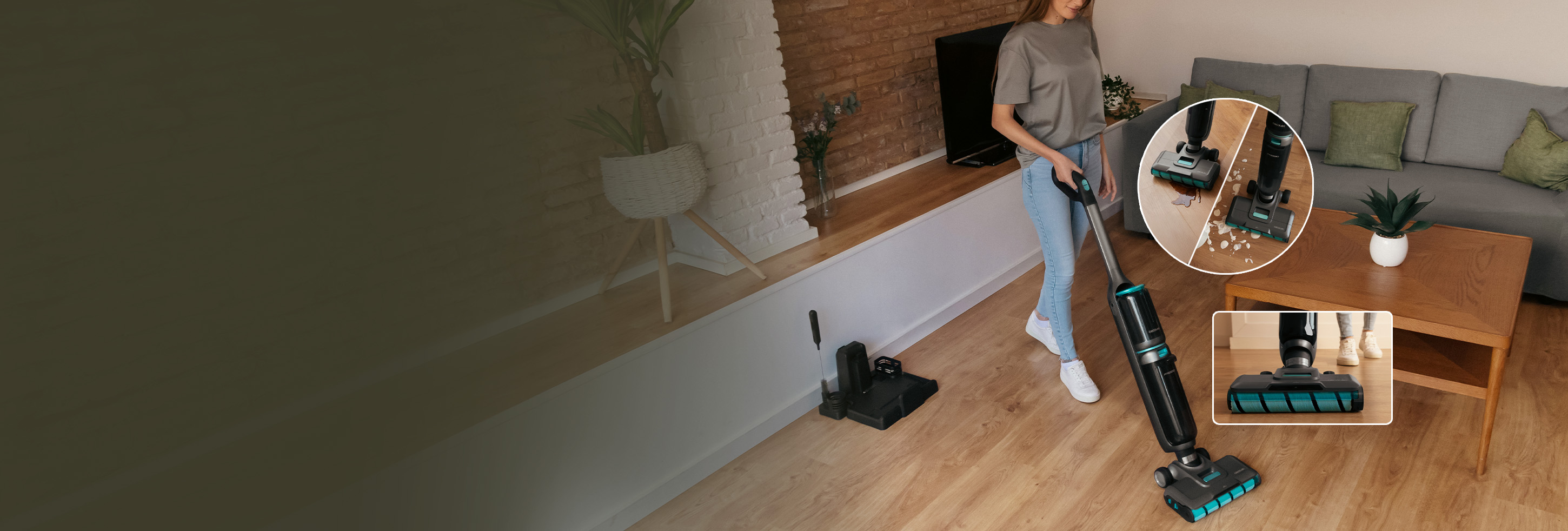 FreeGo Wash&Vacuum Spray Balai électrique 250 W. Frotte et aspire en même temps. 35 minutes d'autonomie. Rouleau absorbant humide Jalisco. Spray d'eau détartrant contre la saleté. Réservoir d'eau propre de 700 ml et eau sale de 750 ml. Base autonettoyante et autoséchante. Avec 2 modes, manuel et automatique. Écran numérique.