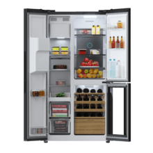 Bolero CoolMarket TDW 529 WID Black Glass E Réfrigérateur 3 portes en verre noir avec cave à vin et Icemaker, 183 cm de hauteur, 91,1 cm de largeur et 70,6 cm de profondeur, capacité 529 L, compresseur Inverter Plus, Total No Frost, classe énergétique E. De plus, Il dispose de différents modes tels que Fast Cooling et Fast Freezing, ainsi que de systèmes tels que MultiAirFlow, Metal Cooling et le mode vacances.